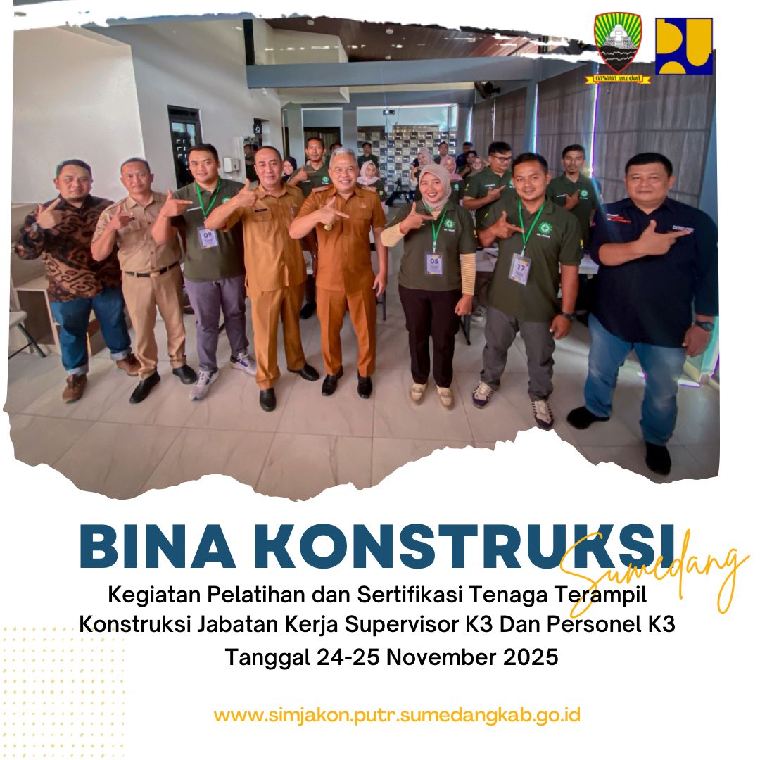 Dalam rangka pelaksanaan Kegiatan Peningkatan Kompetensi Tambahan (PKT) dan Sertifikasi Tenaga Kerja Konstruksi (TKK) Program Pendidikan Vokasi Bidang Infrastruktur Tahun Anggaran 2024, Dinas Pekerjaan Umum dan Tata Ruang Kabupaten Sumedang bekerjasama dengan Balai Jasa Konstruksi Wilayah III Jakarta, akan menyelenggarakan Sertifikasi Tenaga Kerja Konstruksi (TKK) Jenjang 5, 6 dan/atau 7.
